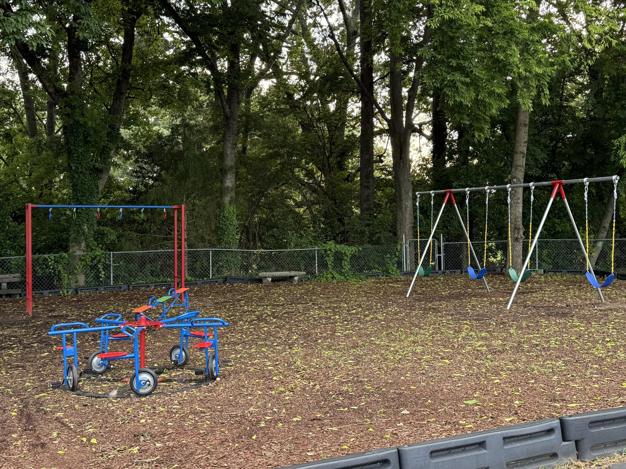 Child's playground with a blue spinning merry-go-round, a red and blue spring rocker, and a climbing structure on wood chips, surrounded by trees and a chain-link fence.